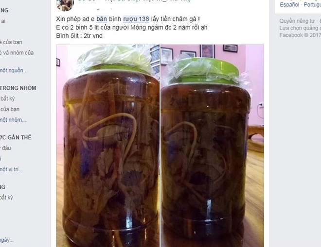 Điển hình như trang mạng có đường link: www.facebook.rxxx, chủ nhân trang mạng này không ngần ngại chào hàng: "Xin phép, em bán bình rượu "138" lấy tiền chăm gà. E (em-pv) có 2 bình 5 lít của người Mông ngâm được 2 năm rồi ạ!", theo thông tin này cho biết thì mỗi bình có dung tích 5 lít giá là 2 triệu đồng.