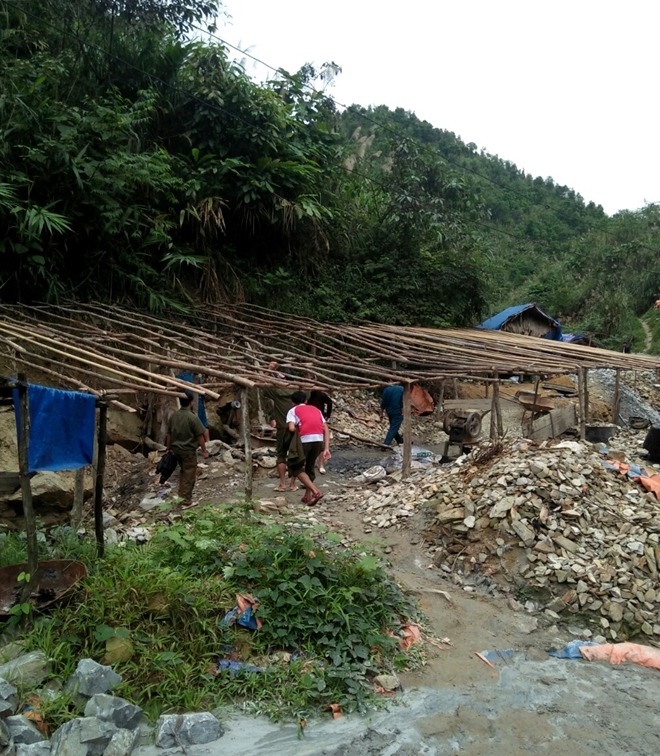 | Lực lượng chức năng tiến hành truy quét, phá lán trại tại khu vực Dốc Mới. |