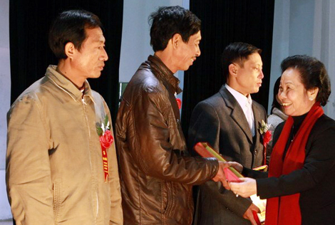 | Phó Chủ tịch nước Nguyễn Thị Doan khen thưởng các gia đình có người hiến giác mạc ở huyện Kim Sơn, Ninh Bình (Ảnh: TTXVN). |