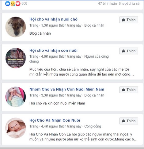 Trong các hội nhóm này, vẫn còn nhiều bài đăng về các trường hợp cho và nhận con để nuôi. Những người đăng bài cho con, hầu hết là những cô gái trẻ, có hoàn cảnh khó khăn hoặc không muốn nuôi dưỡng đứa bé. Không rõ trong số những người này, có bao nhiêu người thực sự là những người mẹ hiếm muộn muốn nhận nuôi con bởi phần lớn những người đăng bài hay bình luận đều sử dụng Facebook ảo, thông tin giả.