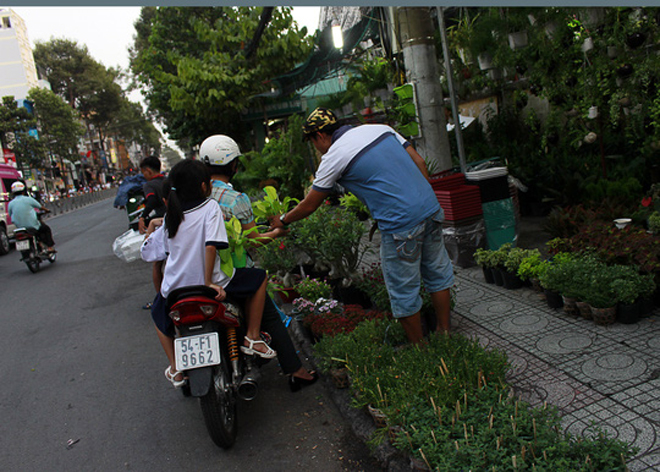 | Cửa hàng hoa cảnh lấn sát ra lòng đường Lê Hồng Phong. |