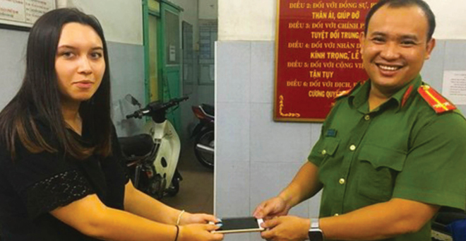 | Công an TP Hồ Chí Minh tiếp xúc và trao trả lại tài sản cho du khách nước ngoài. |