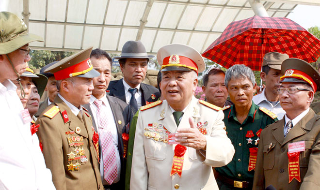 | Đại tá Hoàng Đăng Vinh (ở giữa) ôn lại kỷ niệm với các đồng đội trong một lần thăm lại chiến trường Điện Biên Phủ. |