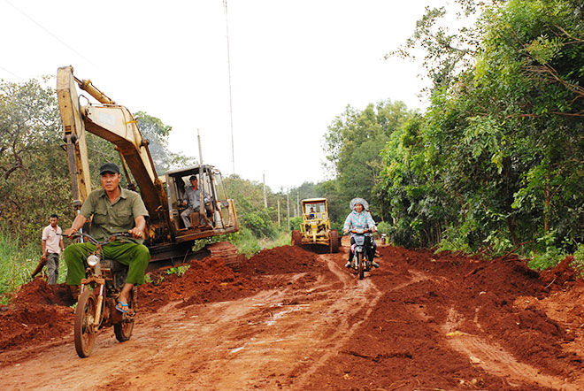 | Các phương tiện đang thi công quãng cuối cùng tại ấp 5, xã Nghĩa Trung, huyện Bù Đăng để hoàn thiện đoạn đường. |