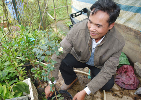 | Ông Lương Văn Dũng bên những cây trà mi đang được trồng nhân giống tại Trường ĐH Đà Lạt. |
