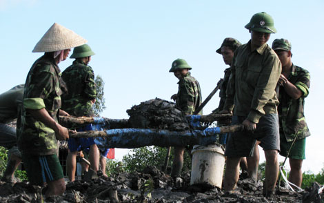 | Cán bộ, chiến sỹ Đồn Biên phòng Sông Đốc (Cà Mau) giúp địa phương làm đường giao thông nông thôn. |
