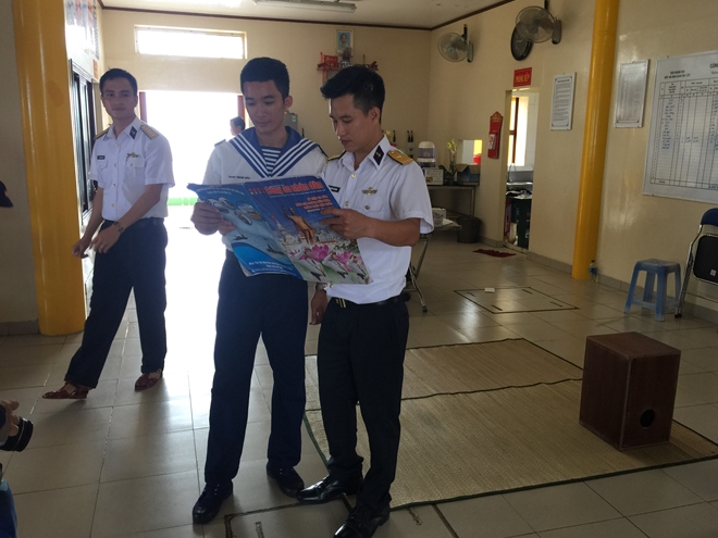 Các chiến sĩ Nhà giàn DK1/21 đọc ấn phẩm  Báo CAND số đặc biệt.