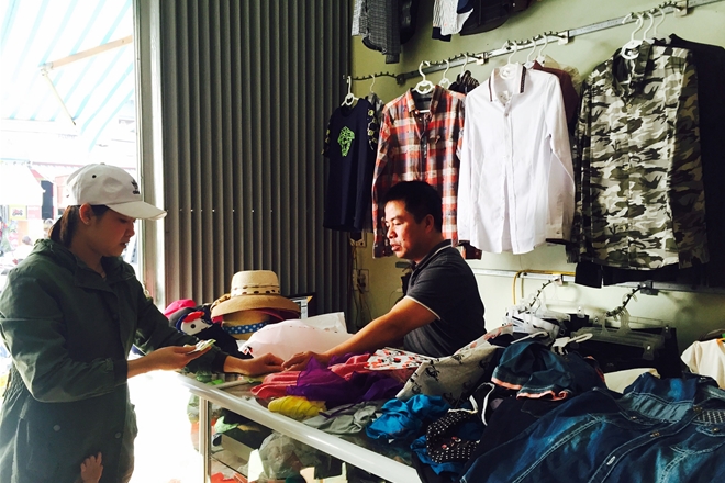 | Anh Phạm Quang Minh (44 tuổi, trú tại xã Nguyên Xá, huyện Vũ Thư, tỉnh Thái Bình) đang bán thanh lý số quần áo ở cửa hàng để lấy tiền trả nợ. |