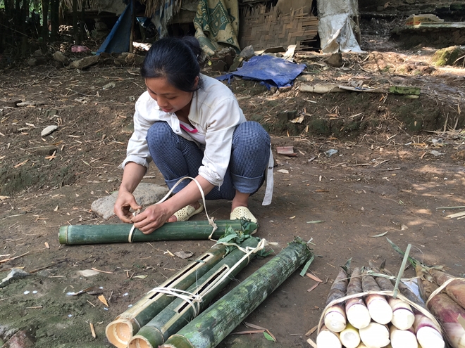 Ngồi lặng lẽ một góc dưới dốc lên đền, Bàn Thị Nga 29 tuổi ở xóm Mó Nẻ, xã Vầy Nưa bày bán cả cua, măng tươi và củ đinh lăng. Cua suối to gấp vài lần cua đồng, ngọ nguậy trong ống tre thút nút bằng lá chuối có khoét khe thông hơi. Một ống cua có gần chục con được bán 30.000 đồng. Nga kể, một ngày đi bắt cua, đào măng, một ngày bán.