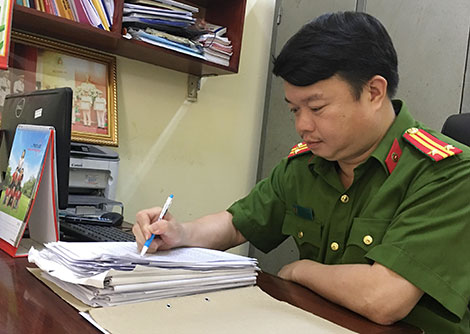 | Trung tá Vương Hồng Sâm nghiên cứu hồ sơ vụ án. |