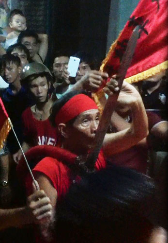 Bất ngờ, "vị thần" chộp lấy cây kiếm trên bàn hương án múa vài chiêu rồi thè lưỡi dài ra, dùng mũi kiếm rạch mạnh nhiều nhát. "Vị thần" dùng máu của mình thấm vào những lá bùa màu vàng do một số thanh niên chuyền tay đưa đến. Đám đông trở nên nhốn nháo. Ai cũng muốn mình có một lá bùa máu của "vị thần".