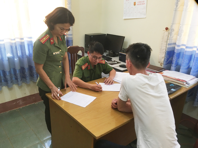 | Thiếu tá Hoàng Thị Hồng Mận cùng lực lượng Công an xã Đắk Wer làm việc với một đối tượng trong diện quản lý. |