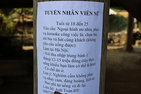 Ông Cụt Văn Thông (67 tuổi, trú tại bản khe Tang, xã Chiêu Lưu, Kỳ Sơn, Nghệ An) kể: Thời gian gần đây, tại bản khe Tang xuất hiện một nam thanh niên đi dán tờ rơi tuyển dụng lao động từ đầu đến cuối bản. Nội dung chỉ tuyển dụng lao động nữ, tuổi từ 18-25, làm công việc chọn bài, rót bia và hát karaoke cùng khách với mức lương trung bình từ 12 đến 15 triệu đồng và có chỗ ăn ở.