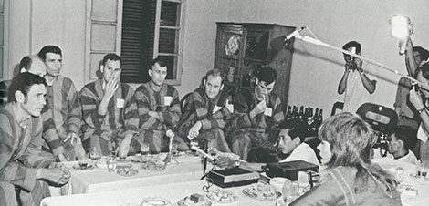 | Ông Walter Eugene Wilber cùng các tù binh phi công Mỹ trong cuộc gặp với Jane Fonda. Ảnh: Chu Chí Thành. |