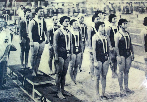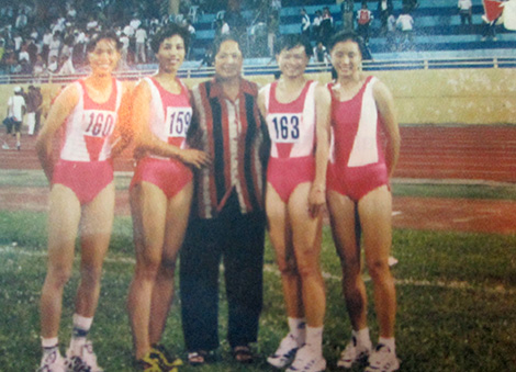 | Bà Hoàng An chụp ảnh cùng những học trò trong đội điền kinh tiếp sức 4x100m nữ Hà Nội.Khoảnh khắc bà Hoàng An giành Huy chương Đồng tại giải Ganefo năm 1963 (Indonesia). |