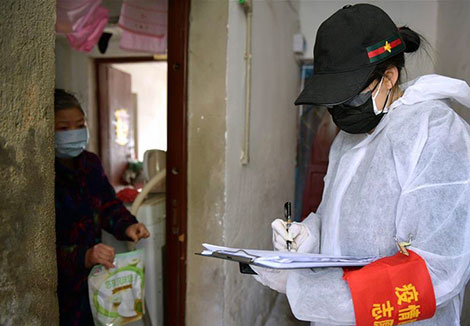 | Nhân viên cộng đồng đang phân phát thực phẩm cho người dân tại quận Vũ Xương, Vũ Hán ngày 9/2. |