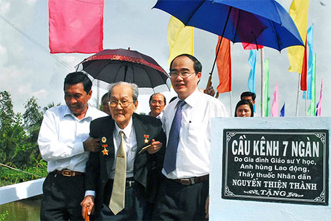 Giáo sư Nguyễn Thiện Thành trong một lần về thăm Cà Mau, nơi ông nghiên cứu và bào chế ra Filatov chữa bệnh cho hàng ngàn người.