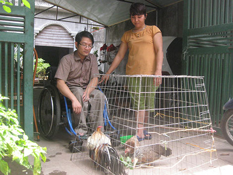 Bước qua hàng hiên, tôi thấy một người đàn ông ngồi trên xe lăn đang rửa bát đũa. Còn người phụ nữ chân bước tập tễnh đang hí húi dọn dẹp ở ngoài sân. Thấy có khách, anh liền dừng công việc, ra bàn pha nước mời khách. Dọn dẹp xong, người phụ nữ chân bước tập tễnh xách một thùng gì đó ra chỗ chiếc xe máy (được cải tiến thành xe mô tô ba bánh cho phù hợp với người khuyết tật) và nổ máy đi đâu đó.