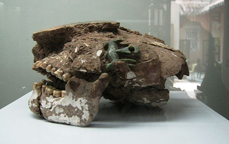| Sọ người với khuyên tai hình hai đầu thú cách nay khoảng 2.000 năm trưng bày trong Bảo tàng. |