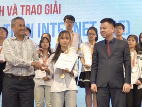 | Em Vũ Thảo Hiền tại lễ vinh danh và trao giải Cuộc thi Olympic tiếng Anh trên Internet cấp toàn quốc năm học 2019-2020. |