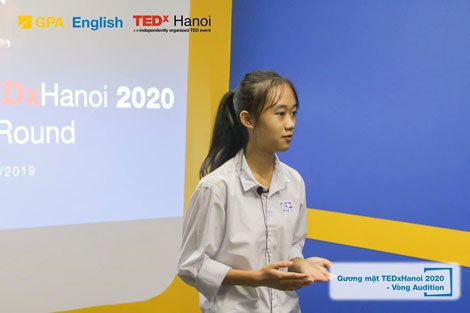 | Em Vũ Thảo Hiền hùng biện tiếng Anh trong cuộc thi Top100 TEDxHanoi. |