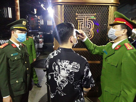 | Công an quận Hoàn Kiếm tổ chức kiểm tra phòng dịch tại quán bar. |