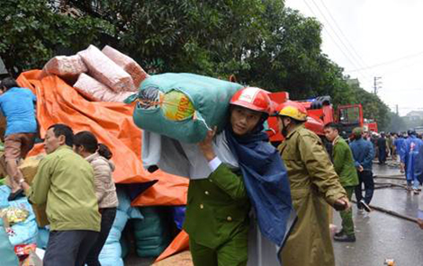 Cán bộ chiến sĩ Cảnh sát PCCC&CHCN giúp dân chuyển hàng khỏi kho bị cháy.