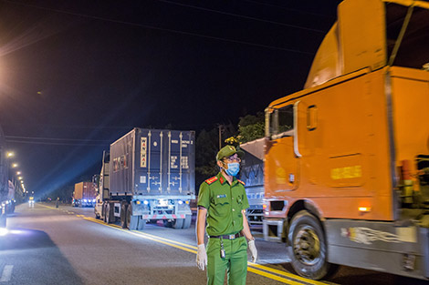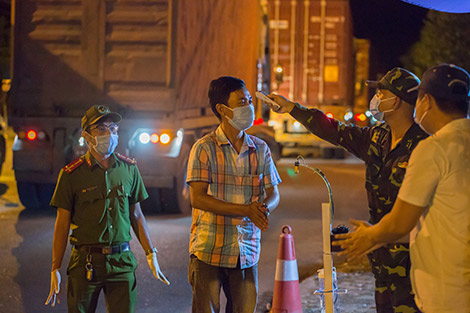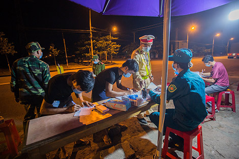 Gạt vội vài giọt nước còn vương lại trong cơn mưa đêm lúc gần 1 giờ sáng, Thượng úy Đàm Quang Vũ, cán bộ công an quận Liên Chiểu (Đà Nẵng) trực đêm tại chốt kiểm soát đường vào hầm Hải Vân xếp lại từng chồng giấy, hướng dẫn từng tài xế kê khai thông tin dịch tễ. Trời đêm lạnh và đầy sương sau cơn mưa vội nhưng lưng áo ướt mồ hôi vì anh phải chạy qua chạy lại kiểm tra, hướng dẫn, kiểm soát từng người, từng xe cùng các đồng đội khác.