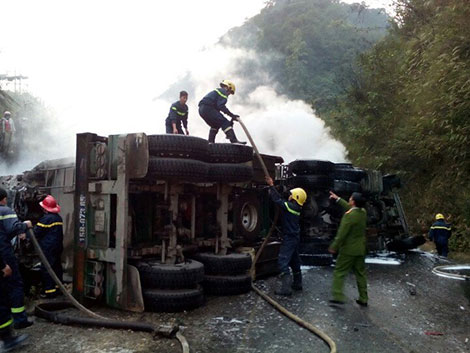 | Cứu hộ vụ lật xe xi-téc chở dầu ở Mai Châu. |