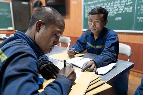 Trước khi xuống hầm, tôi ngồi lọt thỏm giữa phòng giao ban với vài chục người thợ ca 3. Nhóm thợ vẫn còn chưa kịp tắm rửa của ca trước bàn giao lại sổ sách, công việc cho ca sau. Trước khi “xuất kích”, cả phòng đứng dậy nghiêm trang hô to đầy hào khí “An toàn để sản xuất, sản xuất phải an toàn... An toàn, an toàn, an toàn”.
