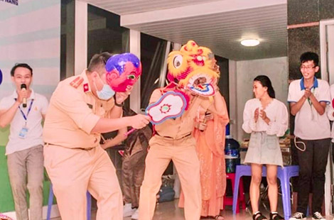 Một ngày giữa tháng 9-2020, tại tầng 10, Khoa Nhi, Bệnh viện Ung bướu Đà Nẵng, đã diễn ra lễ đón Trung thu sớm “San sẻ yêu thương, trao em nụ cười”. Đã có một màn múa lân đặc biệt dành tặng các em. Đặc biệt ở chỗ, diễn viên vào vai ông Địa, múa lân hôm đó chính là các cán bộ, chiến sĩ, đoàn viên Phòng Cảnh sát giao thông Công an thành phố Đà Nẵng. Thấu hiểu sự thiệt thòi của các em nhỏ ở bệnh viện ít có dịp được vui chơi, “ông Địa áo vàng”, “kỳ lân áo vàng” dù không chuyên nhưng đã hết mình biểu diễn vì bệnh nhi. Những phần quà từ các cô chú công an là chiếc đèn lồng, bánh nướng, bánh dẻo, quả bóng bay đủ sắc màu khiến các em phút chốc như được bay trong thế giới trung thu rực rỡ. Thế giới ấy không có kim tiêm, dây truyền và những cơn đau đang hành hạ, chỉ tràn đầy tiếng cười và niềm vui...