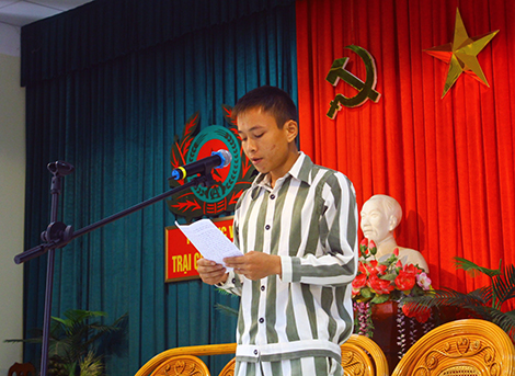| Phạm nhân Nguyễn Hữu Bắc đọc thư trước toàn thể cán bộ và phạm nhân trại giam. |