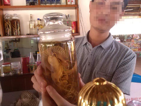 "Tê tê bổ toàn tập. Máu nó giải độc, tăng cường sinh lực, vẩy làm thuốc trị đủ thứ bệnh. Thịt tê tê thì đại bổ dưỡng, ăn vào gân cơ rắn chắc, có lực… Mấy cái này không phải tôi nói mà là sách nói, được các lương y ghi chép hẳn hoi. Có tài liệu còn ghi máu và nhất là cái vảy của tê tê trị được ung thư nữa kia" - ông khách luống tuổi dáng phốp pháp nói với chúng tôi lúc ghé quán Bến Lội rinh một lúc 2 hũ rượu ngâm bào thai tê tê, trước khi lên xe.