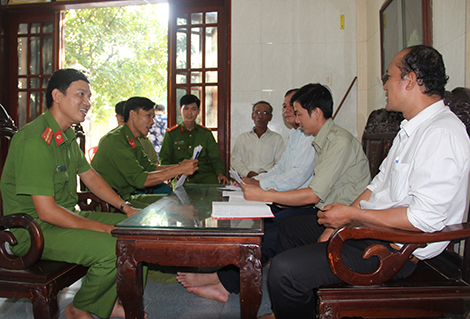 | Thượng úy Võ Sỹ Thanh (bên trái) cùng cán bộ chiến sĩ Công an xã Phú Mậu trao đổi công việc liên quan đến ANTT trên địa bàn. |