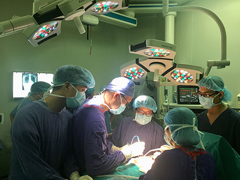 | Các bác sĩ Bệnh viện Việt - Đức đang giải cứu “vòng 2” cho nữ bệnh nhân sau khi tiêm mỡ nhân tạo nâng ngực. |