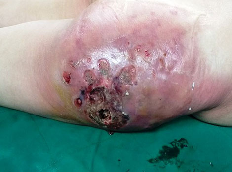 | Phần mông bị hoại tử của bệnh nhân nữ 45 tuổi sau khi tiêm silicon. |