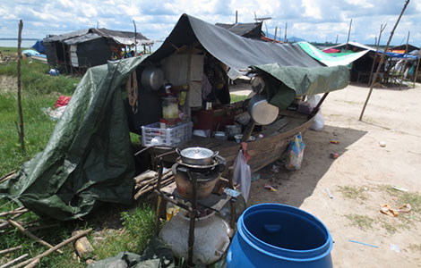 Có chỗ, “nhà” chỉ là một con thuyền gỗ đã hư hỏng, bề ngang chừng 1,2m, dài gần 3m, che chắn sơ sài nhưng lại chứa đến 5 người. Mùa nắng thì nóng còn mùa mưa, nước hồ dâng lên khiến nhiều nhà phải di dời đến chỗ đất cao, chưa kể mùa mưa muỗi từ những cánh rừng cao su đối diện ngửi thấy “hơi” người, bay đến như vãi trấu.