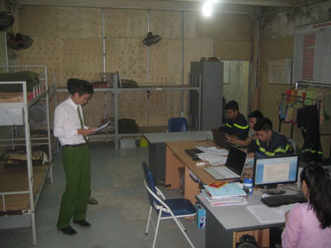 | CBCS Phòng Hoàn Kiếm ăn ở, sinh hoạt và làm việc chung trên một mặt sàn, ngăn với nhau bởi các vách tường gỗ ép tạm bợ. |