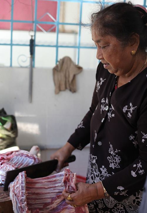 | Bà Fatima Beevi, con gái ông B. Ahamad, đang bán thịt dê cho khách hàng. |