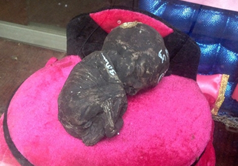 Ở giữa gian phòng là bức tượng một chú bé con, đúng hơn là một hình hài của một đứa bé sơ sinh còn nguyên dáng trong bụng mẹ đã khô quắt và được phủ một lớp kim loại màu vàng. Đứa bé được đặt ngồi trên một hộp gỗ. Xung quanh đó là hàng trăm bức tượng các em bé bằng thạch cao.