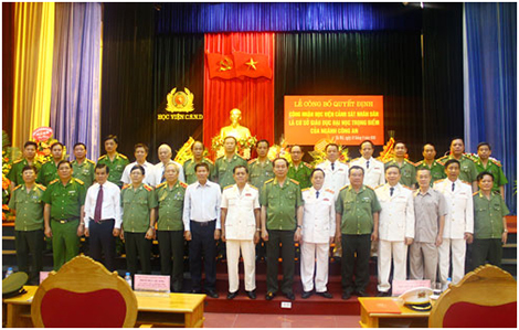 | Bộ trưởng Trần Đại Quang và các đại biểu tại buổi lễ công nhận Học viện Cảnh sát nhân dân thành cơ sở giáo dục đại học trọng điểm của Ngành Công an năm 2015. |