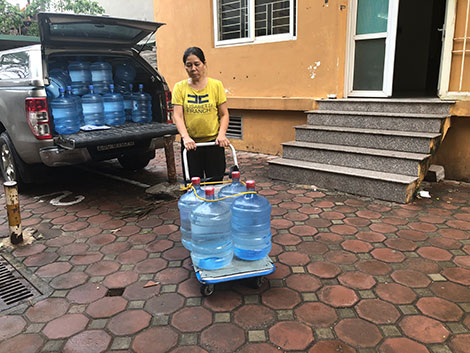 Cửa hàng bán bình nước đóng sẵn của cô Vũ Thị Tĩnh ở ngay tầng 1 khu chung cư A2, ngõ 85 phố Hạ Đình, quận Thanh Xuân. 4 giờ chiều, cô Tĩnh đang nhập thêm nước về bán. Bởi chỉ một lúc nữa thôi, khi các hộ dân cư tan tầm trở về nhà là đến giờ cao điểm bán hàng của cô. Cả khu nhà ai cũng gọi mua nước, cô lại thoăn thoắt khuân những bình nước lên các tầng cao.