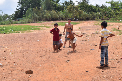 Hơn 10 giờ trưa, những đứa trẻ làng bè Suối Tượng tập trung tại bến bãi đầu làng bè để vui đùa. Đứa không đội nón, đứa để lưng trần đen sạm cùng nhau háo hức tham gia trò chơi tạt dép (đặt vật nhỏ ở giữa vòng tròn, người chơi cầm chiếc dép đứng từ xa ném, ai ném trúng vật đó văng ra ngoài là người chiến thắng, gần giống như trò ném ống bơ của trẻ con vùng Đồng bằng Bắc bộ).