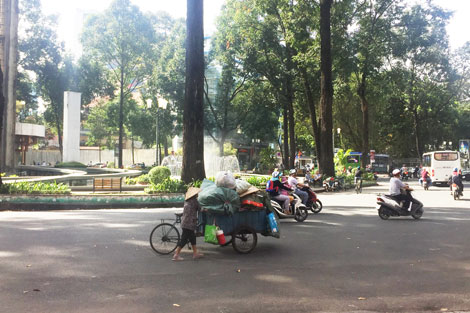 Tại công viên 30-4 nằm trước hội trường Thống Nhất ban ngày là nơi vui chơi, sinh hoạt, hóng mát của các bạn trẻ nhưng tối đến lại xuất hiện những cụ ông, mòn mỏi trên những chiếc xe đạp ghé đến. Ông Trần Văn Tư, năm nay cũng đã 75 tuổi, ngụ Q.4, chuyên nghề nhặt ve chai ở đây kể: “Mấy chục năm rồi tui sống nhờ vào những thùng rác công cộng đặt trong công viên này. Tui đạp xe tới, mang theo bì ni lông loại lớn để nhặt nhạnh những vỏ chai nước suối, bì ni lông, tờ báo bị vứt bỏ để mang ra vựa phế liệu bán lại. Ngày trước cũng kiếm được trăm nghìn đồng nhưng bây giờ người già đi làm như tui nhiều quá nên mình cũng phải san sẻ để họ sống nữa chứ”.