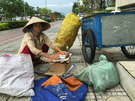 Sau khi đếm vỏ lon xong, bà lấy mấy tờ tiền mang đi làm vốn, giắt ở lưng quần ra trả rồi hồ hởi mang đến các vựa phế liệu để bán. “Mỗi vỏ lon tui lời được 300 đồng, so với một tờ vé số thì ít hơn nhưng nghề này ít phải cạnh tranh. Mình có mối quen thì cũng sống được. Trưa đến thì tui tiếp tục rong ruổi quanh hồ Con Rùa, đi tới các “bạn hàng” là các quán nhậu dọc đường Phạm Ngọc Thạch để tiếp tục mua vỏ bia” - bà Chi nói.