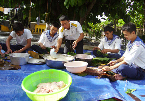 Nhưng có lẽ rộn ràng và vui nhất là cảnh những người lính trẻ quây xung quanh cái chiếu ni lông... gói bánh chưng. Lá dong gửi từ đất liền ra, có lẽ chỉ còn xanh khi các con tàu đến điểm đảo đầu tiên là Trường Sa Lớn và Song Tử Tây... còn đến các đảo nổi, đảo chìm khác thì lá dong đã... héo quắt.