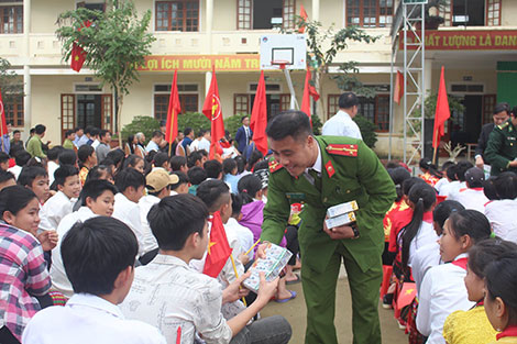 | Thượng úy Lay Văn Thìn tặng quà tết cho các em học sinh Trường THCS xã Môn Sơn trong buổi tuyên truyền phổ biến pháp luật tại trường. |