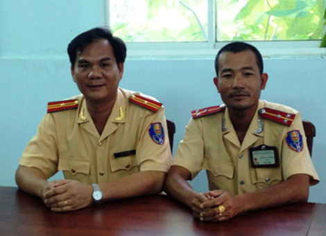 Thượng úy Trương Tấn Thương (bên phải) và lãnh đạo đội CSGT Phú Lâm.