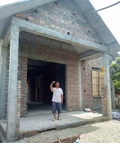 | Ông Thắng trước ngôi nhà đang xây dựng. |