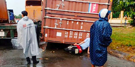 Người dân trên đường Độc Lập (đoạn trước nhà khách Quân đoàn 4, thị xã Dĩ An) vẫn chưa thôi ám ảnh vụ xe đầu kéo rơi container đè vào một phụ nữ đang điều khiển xe máy lưu thông phía sau. Xe đầu kéo BKS 51D-309.26 lưu thông hướng về cầu vượt Sóng Thần, qua gờ giảm tốc với tốc độ cao khiến container trên rơ-moóc bật chốt rơi xuống, lật ngang đường.